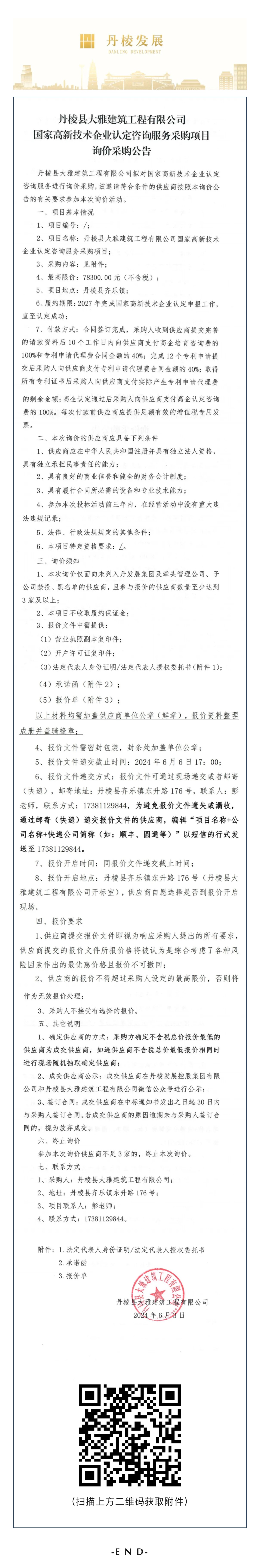 丹棱縣大雅建筑工程有限公司國(guó)家高新技術(shù)企業(yè)認(rèn)定咨詢服務(wù)采購項(xiàng)目詢價(jià)采購公告