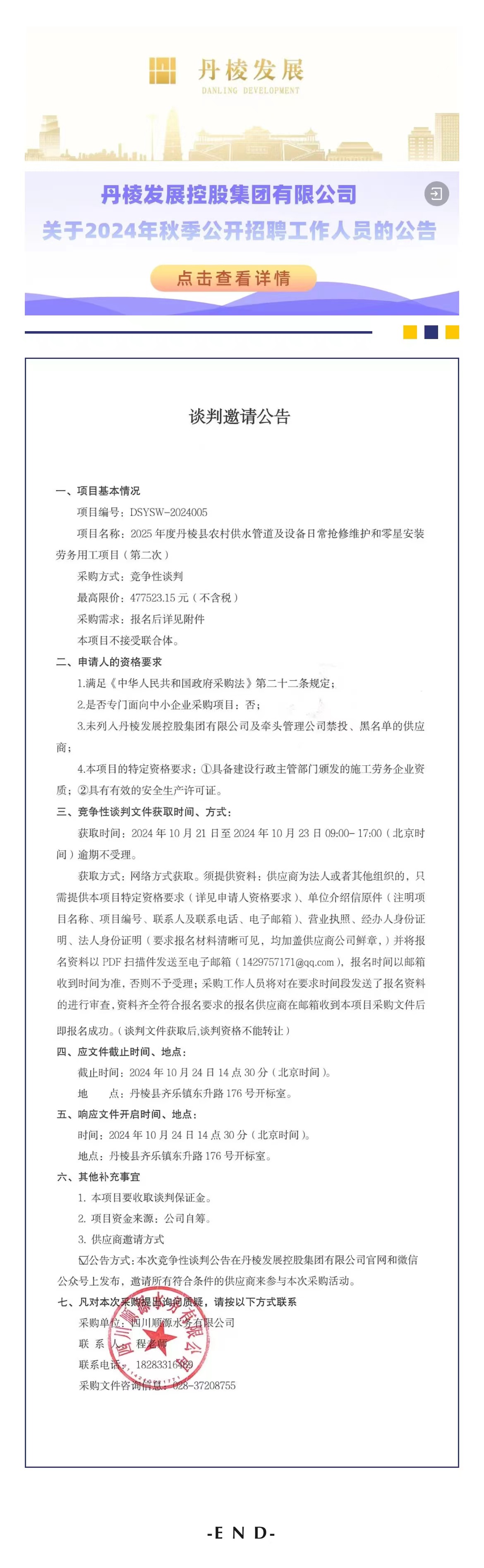 2025年度丹棱縣農(nóng)村供水管道及設(shè)備日常搶修維護(hù)和零星安裝勞務(wù)用工項(xiàng)目第二次談判邀請(qǐng)公告