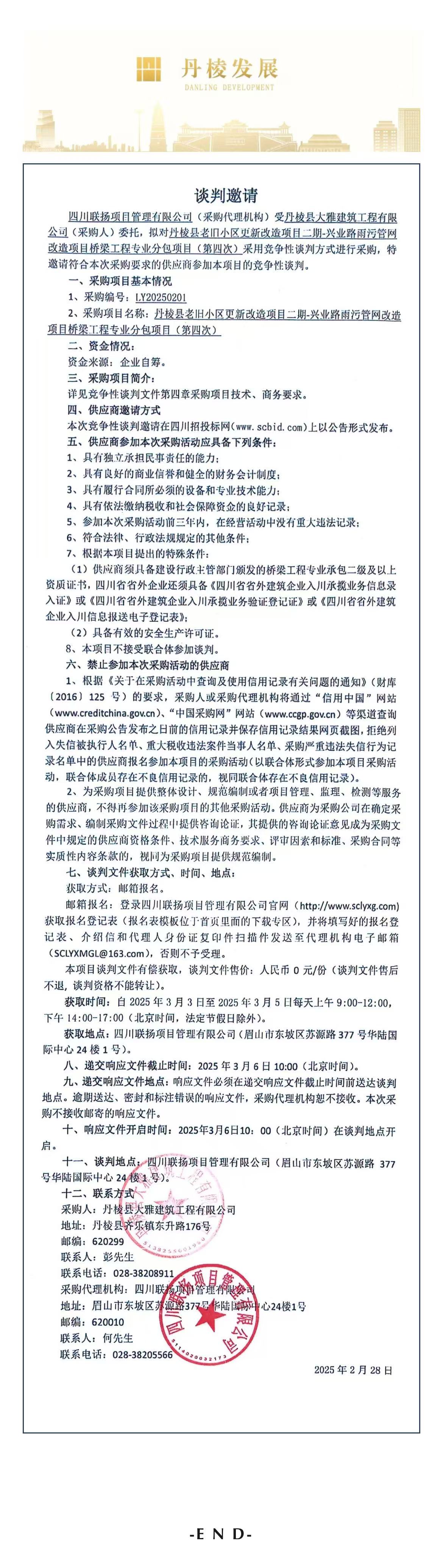 丹棱縣老舊小區(qū)更新改造項(xiàng)目二期-興業(yè)路雨污管網(wǎng)改造項(xiàng)目橋梁工程專業(yè)分包項(xiàng)目談判邀請公告(第四次)