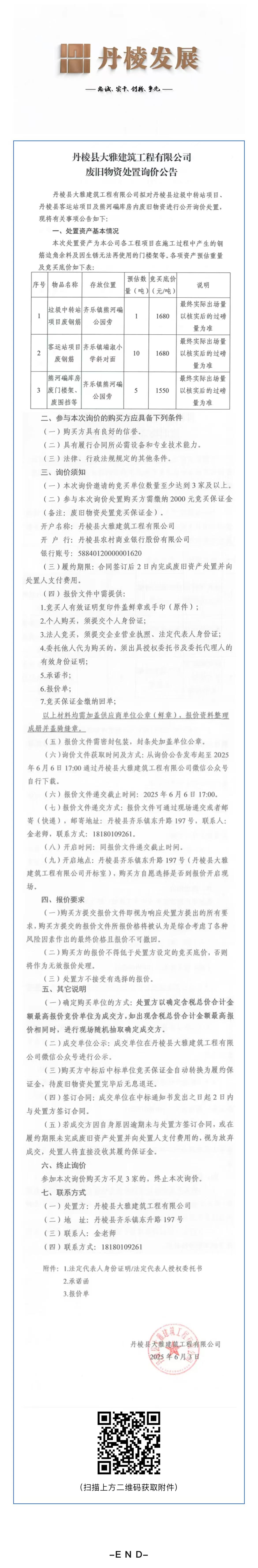 丹棱縣大雅建筑工程有限公司廢舊物資處置詢價公告