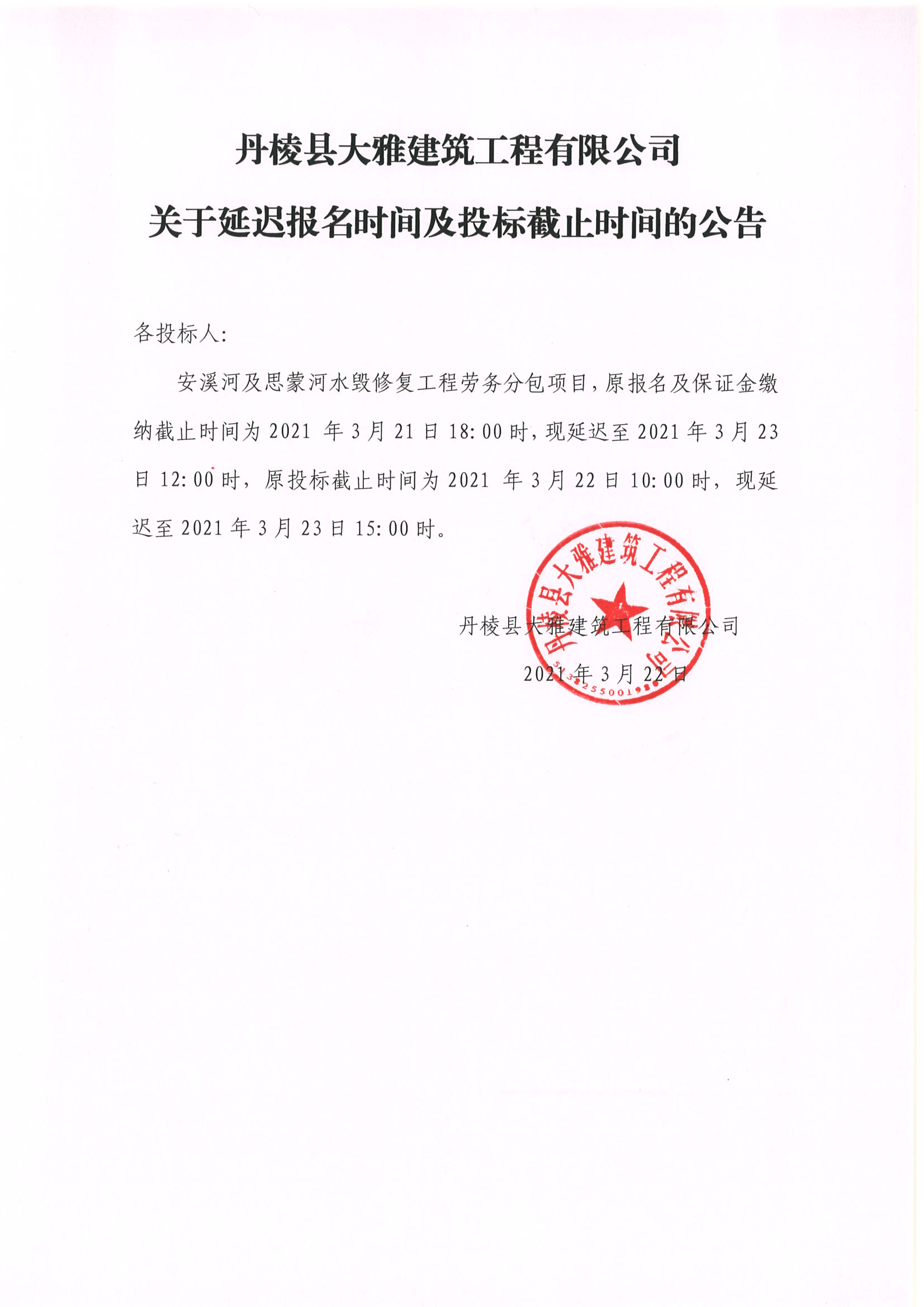 【大雅建筑公司】關(guān)于安溪河及思蒙河水毀修復(fù)工程勞務(wù)分包項(xiàng)目延遲報(bào)名時(shí)間及投標(biāo)截止時(shí)間的公告