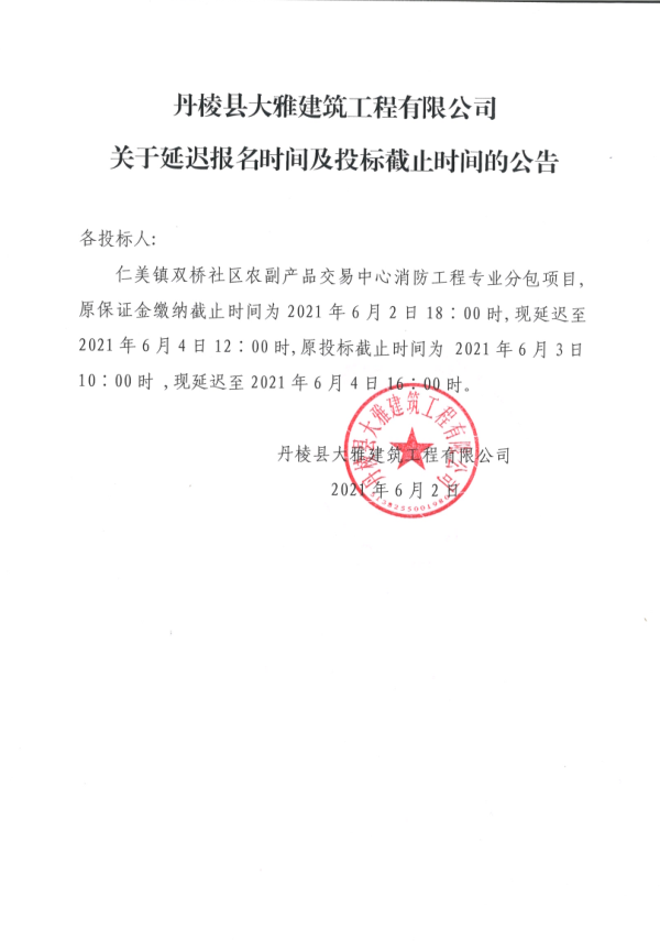 【大雅建筑公司】丹棱縣大雅建筑工程有限公司關(guān)于延遲報(bào)名時(shí)間及投標(biāo)截止時(shí)間的公告
