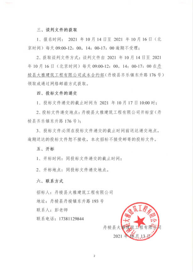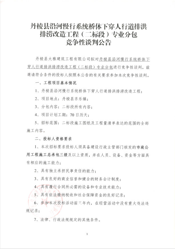 【大雅建筑公司】丹棱縣沿河慢行系統橋體下穿人行道排洪排澇改造工程(二標段)專業(yè)分包競爭性談判公告