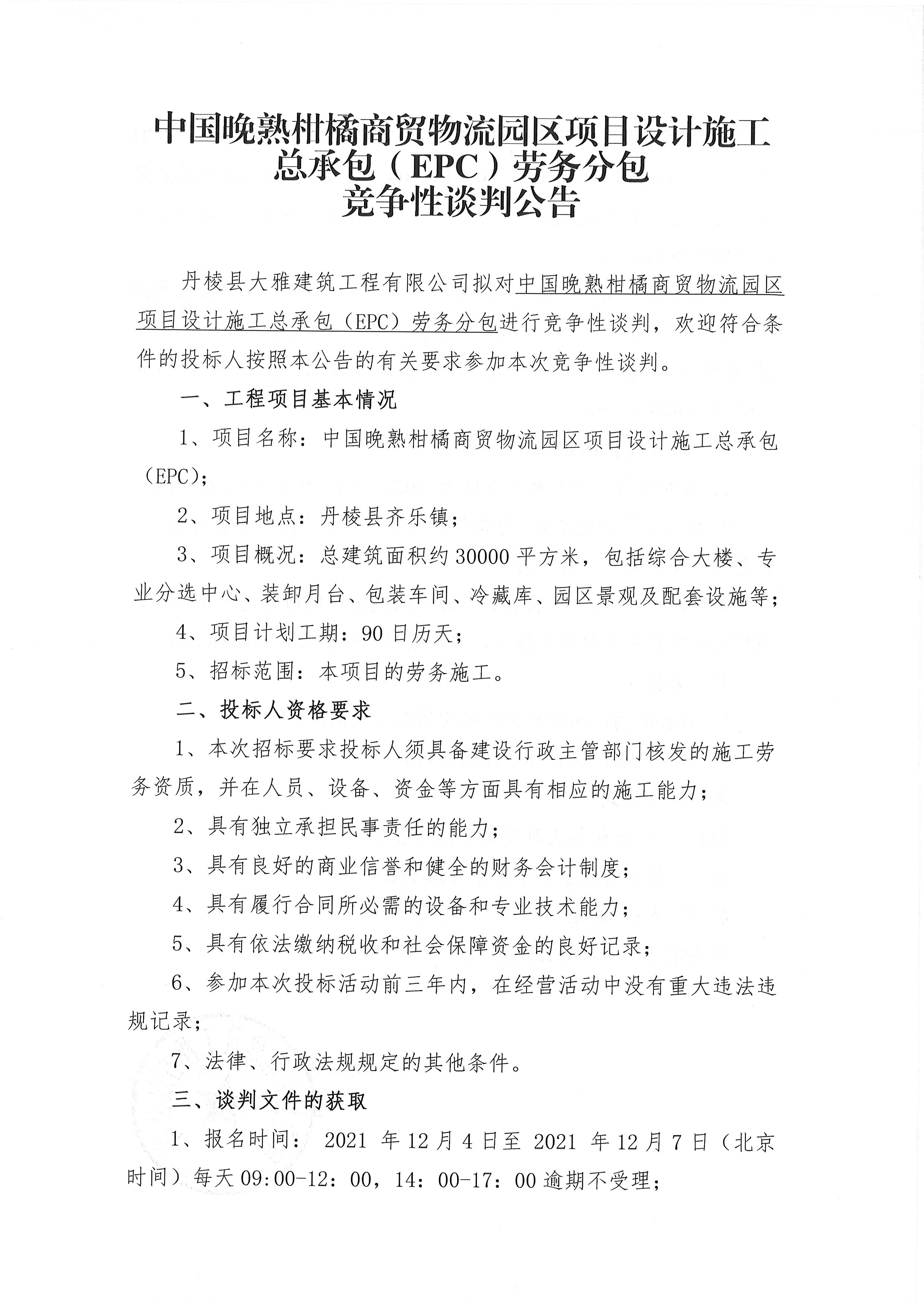 【大雅建筑公司】中國晚熟柑橘商貿(mào)物流園區(qū)項目設(shè)計施工總承包(EPC)勞務分包競爭性談判公告