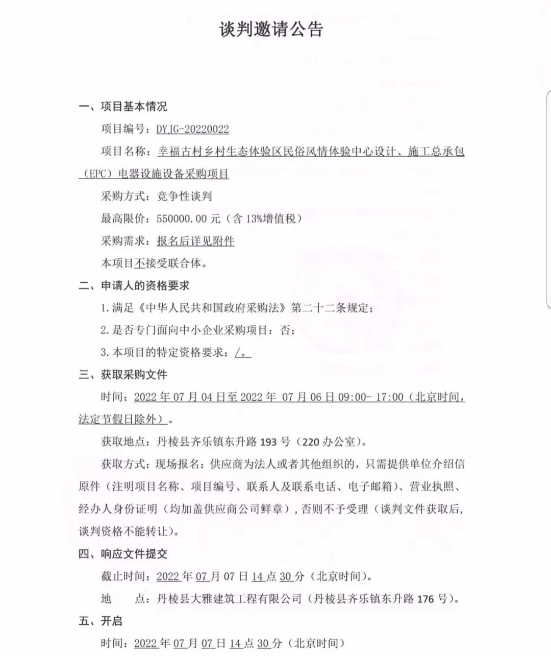 幸福古村鄉(xiāng)村生態(tài)體驗(yàn)區(qū)民俗風(fēng)情體驗(yàn)中心設(shè)計(jì)、施工總承包(EPC)電器設(shè)施設(shè)備采購項(xiàng)目談判邀請公告