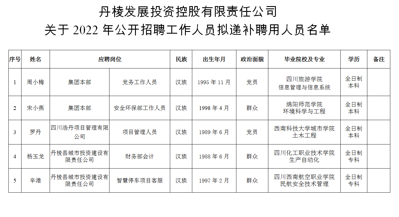 附件:丹棱發(fā)展投資控股有限責任公司關于2022年公開招聘工作人員擬遞補聘用人員名單