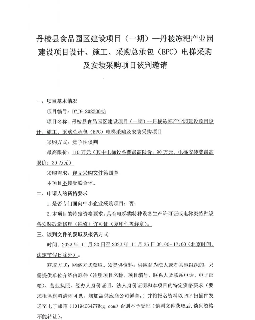 丹棱縣食品園區(qū)建設(shè)項(xiàng)目 (一期)--丹棱凍粑產(chǎn)業(yè)園建設(shè)項(xiàng)目設(shè)計(jì)、施工、采購(gòu)總承包 (EPC) 電梯采購(gòu)及安裝采購(gòu)項(xiàng)目談判邀請(qǐng)公告
