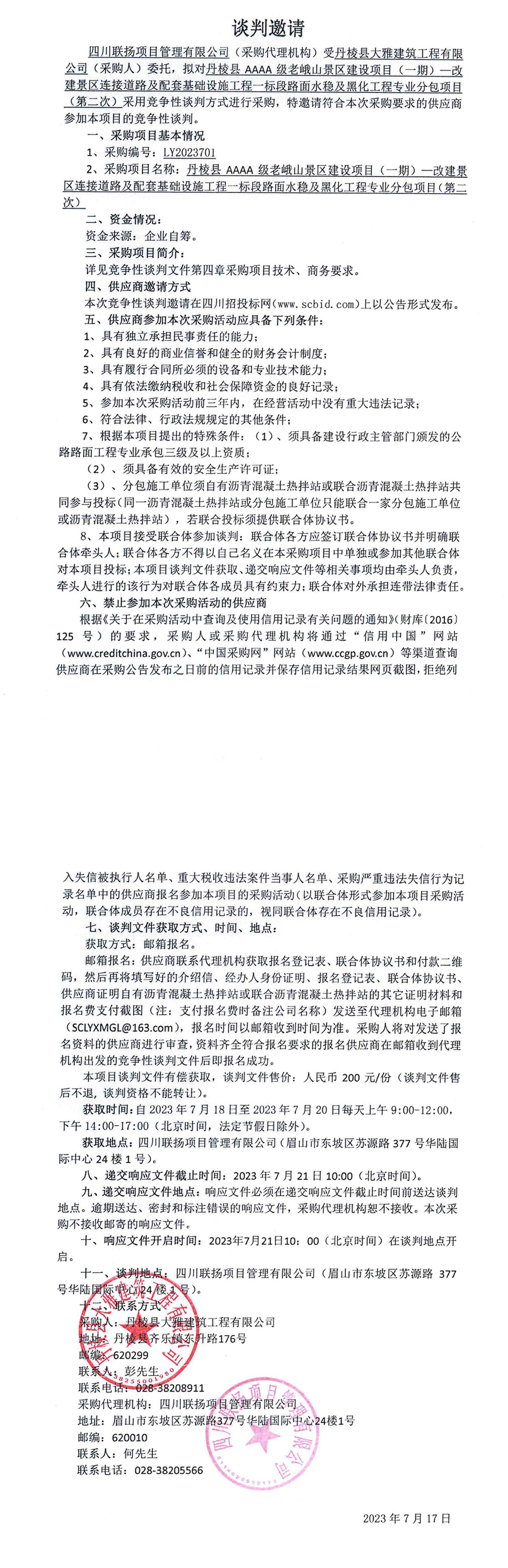 丹棱縣AAAA級老峨山景區(qū)建設(shè)項目(一期)—改建景區(qū)連接道路及配套基礎(chǔ)設(shè)施工程一標(biāo)段水穩(wěn)及黑化工程專業(yè)分包談判邀請公告(第二次)