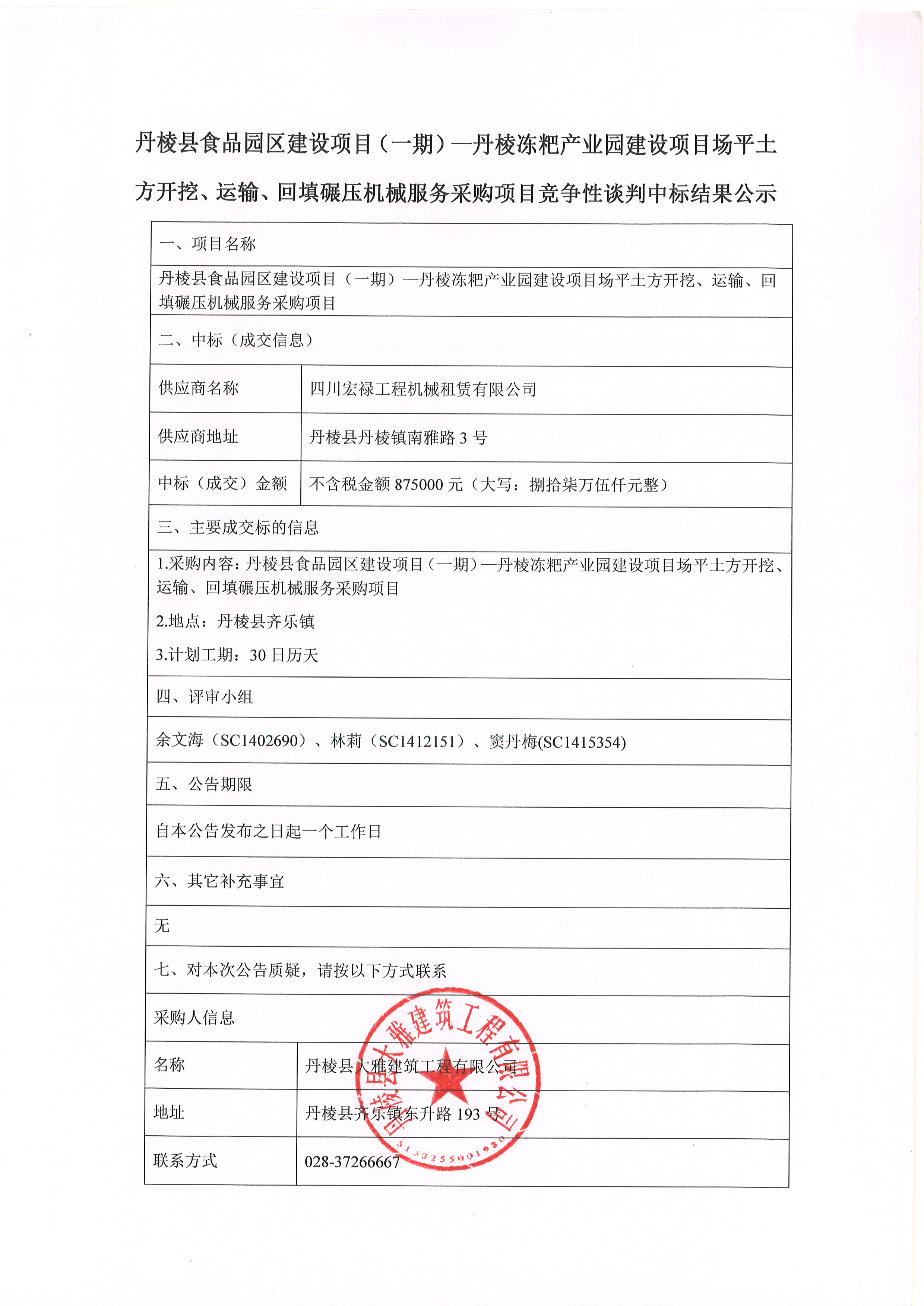 丹棱縣食品園區(qū)建設項目(一期)-丹棱凍粑產(chǎn)業(yè)園建設項目場平土 方開挖、運輸、回填碾壓機械服務采購項目競爭性談判中標結(jié)果公示