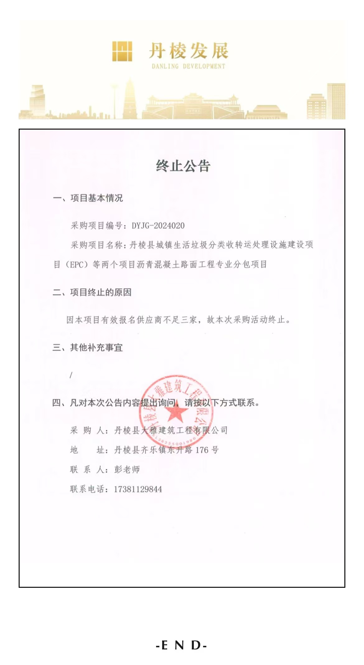 丹棱縣城鎮(zhèn)生活垃圾分類收轉(zhuǎn)運處理設(shè)施建設(shè)項目(EPC)等兩個項目瀝青混凝土路面工程專業(yè)分包項目終止公告