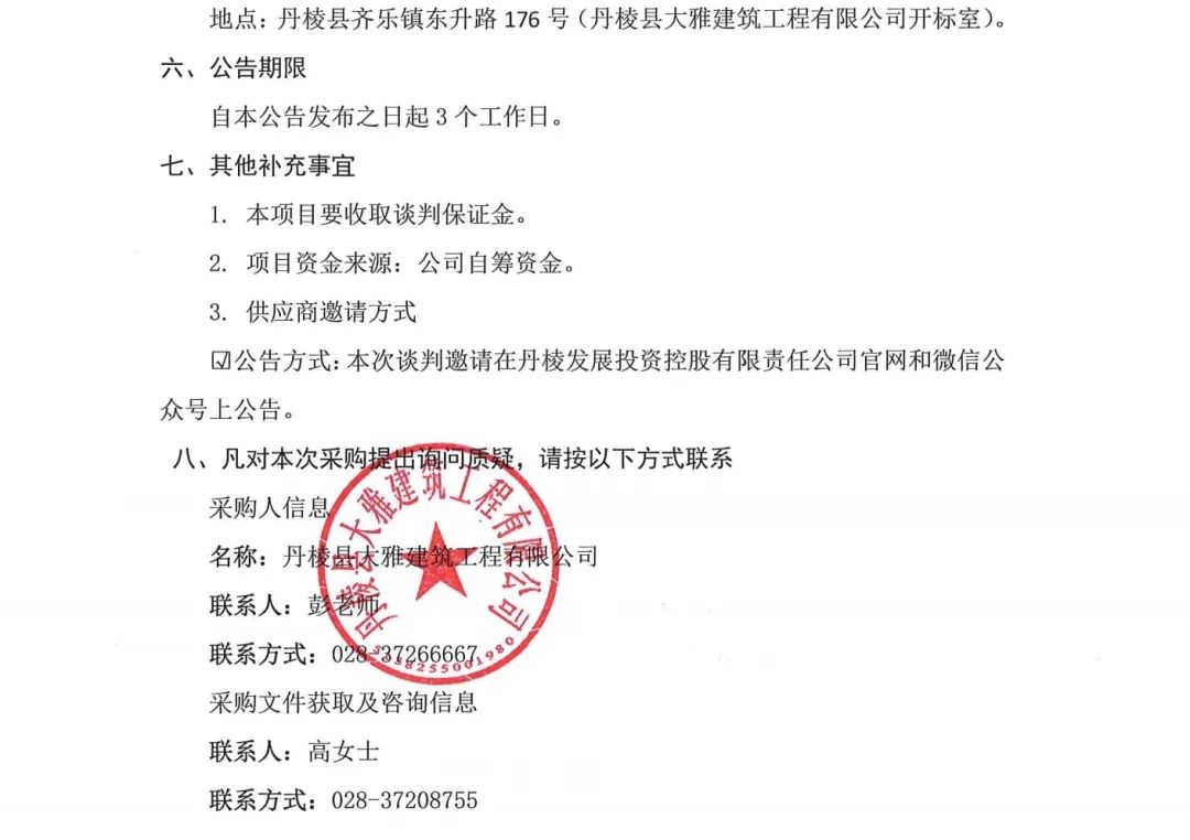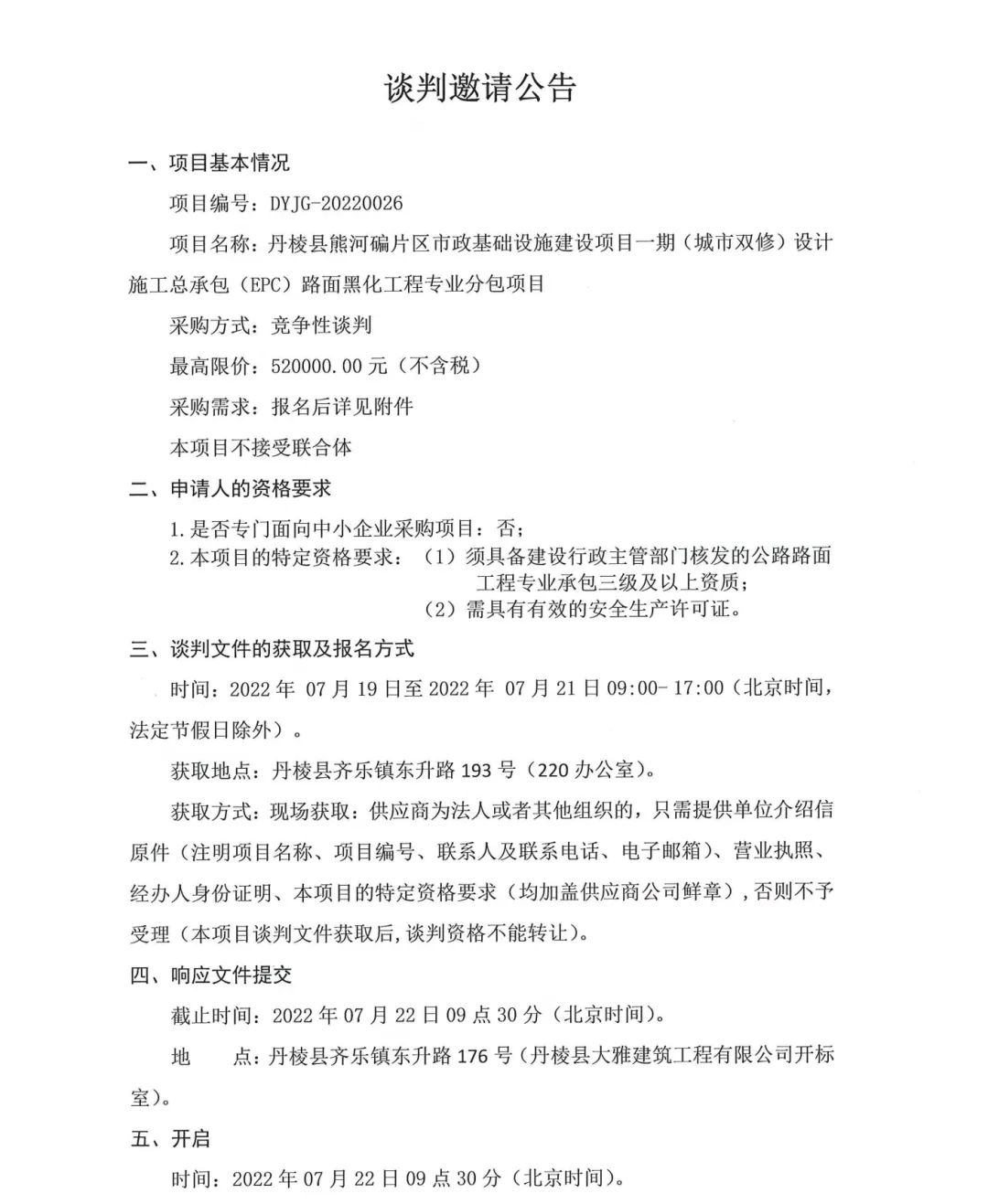 丹棱縣熊河碥片區(qū)市政基礎(chǔ)設(shè)施建設(shè)項(xiàng)目一期(城市雙修)設(shè)計(jì)施工總承包(EPC)路面黑化工程專業(yè)分包項(xiàng)目談判邀請(qǐng)公告