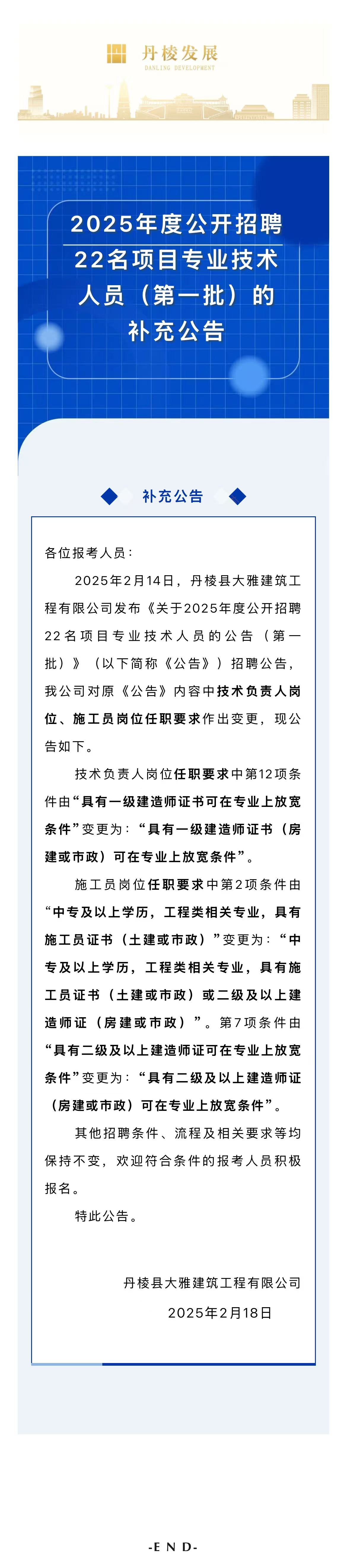 丹棱縣大雅建筑工程有限公司關于2025年度公開招聘22名項目專業(yè)技術人員(第一批)的補充公告