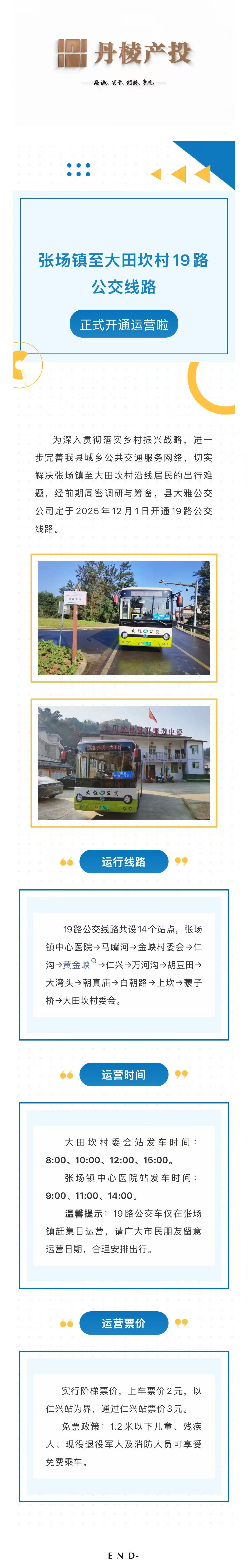 張場(chǎng)鎮(zhèn)至大田坎村19路公交線(xiàn)路正式開(kāi)通運(yùn)營(yíng)啦!
